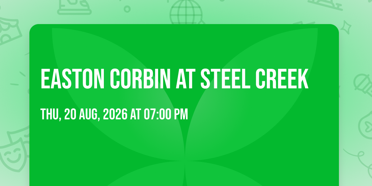 π Step into a world of wonder at Easton Corbin at Steel Creek, where extraordinary moments await! ποΈ Located at Steel Creek in dynamic Tacoma, WA, this event will become the talk of the town. π Join us on August 20th, 2026 at 07:00 PM for a celebration that defies the ordinary. β¨ This curated experience brings together the best of entertainment, culture, and community spirit. Every detail has been thoughtfully planned to ensure an unforgettable experience for all our guests. π― Take advantage of this opportunity to be part of something special. π Early registration is recommended as space is limited!