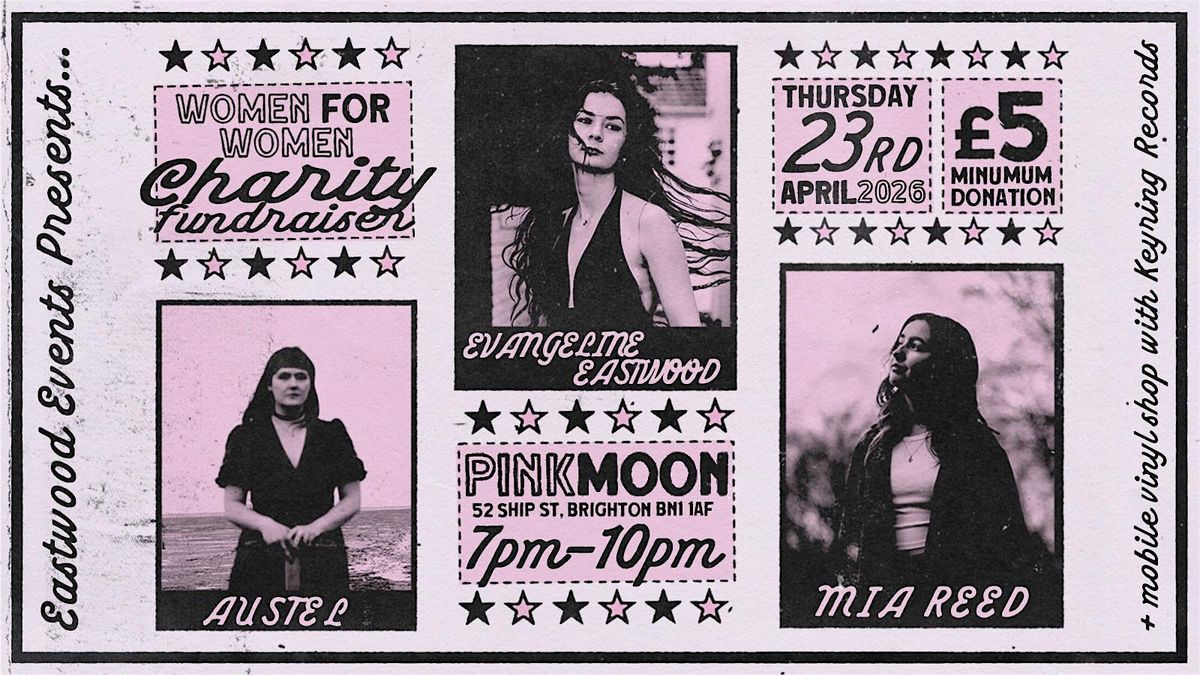 Eastwood Events presents: Our second 'Women For Women' Charity fundraiser music showcase + pop-up vinyl shop with Keyring Record at Pink Moon (Brighton) on Thursday 23rd April, showcasing 3 local act, Evangeline Eastwood, Austel and Mia Reed.