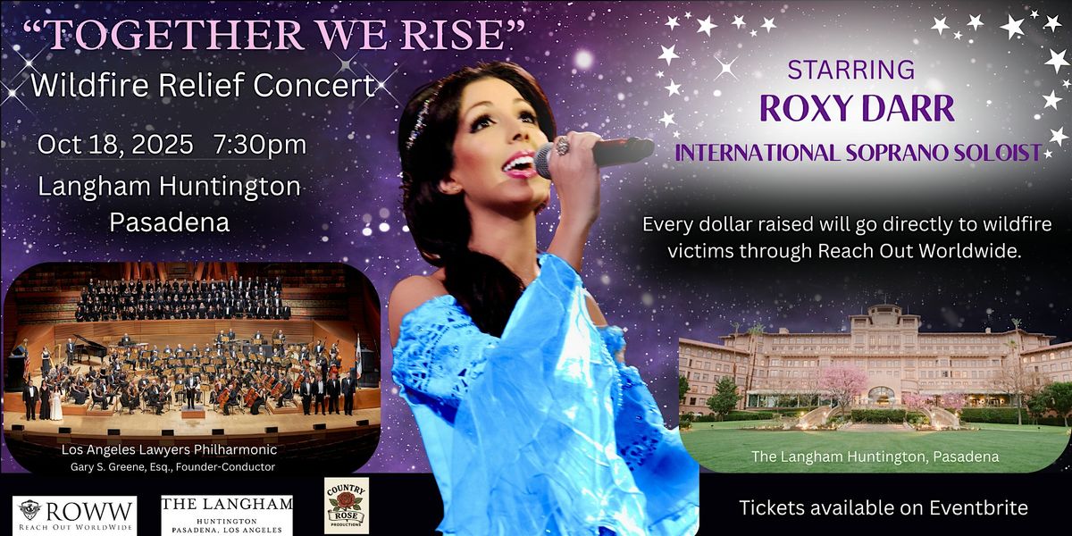 Experience an enchanted evening of music headlined by Pasadena native and world-renowned soprano soloist and attorney Roxy Darr, accompanied by the acclaimed Los Angeles Lawyers Philharmonic under the Musical Direction of Maestro Gary S. Greene Esq. This black-tie evening will take place Saturday, October 18th at 7:30 pm at the historic Langham Huntington, Pasadena. With its blend of artistry, philanthropy, and civic purpose, “Together We Rise” the Eaton Wildfire Relief Benefit Concert is destined to be remembered as one of the most poignant events of the year. Sensational vocalist Roxy Darr will salute the best of Broadway performing favorites including “Memory” from Cats, “Think of Me” and “All I Ask of You” from Phantom of the Opera, “I Dreamed A Dream” from Les Miserables, Don't Cry For Me Argentina from Evita, Con Te Partiro and more. Singer Eric Castro, Esq. will be featured in “Some Enchanted Evening” from South Pacific.