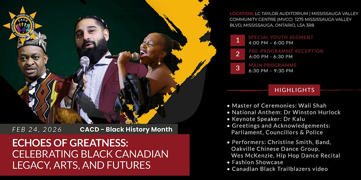Since 2005, Citizens for the Advancement of Community Development has proudly brought communities together to honour Black History Month through education, culture, and celebration. In 2026, CACD invites the community to a meaningful and inspiring evening that reflects on our shared history, celebrates artistic excellence, and points toward the futures we are building together.
