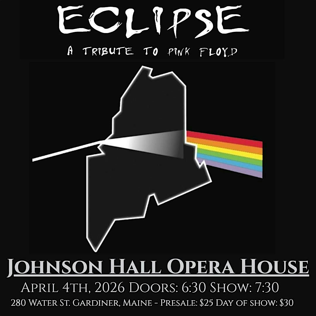 Eclipse will bring its sonic and visual spectacle to Johnson Hall Opera House in Gardiner, Maine. Spanning the iconic 30+ year career of Pink Floyd, Eclipse performs both deep cuts and classic favorites, bringing the ultimate show experience for any Pink Floyd fan.
