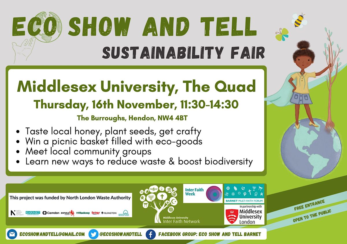 The Eco Show and Tell sustainability fair is coming to Middlesex University, Hendon on Thursday November 16th, 11:30-14:30