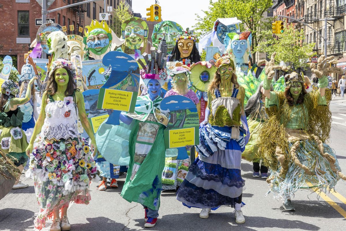 ECOLOGICAL CITY - Procession for Climate Solutions is an urban ecological pilgrimage and an art and climate action. Ecological City features a spectacular procession of visual art, giant puppets, costumes and 21 site performances celebrating climate solution initiatives throughout the community gardens, neighborhood and East River Park waterfront of the Lower East Side.