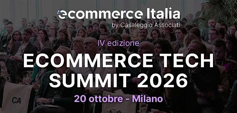 Nella quarta edizione del convegno di presentazione della ricerca “Ecommerce Tech Summit 2026” di Casaleggio Associati, che si terrà il 20 ottobre 2026 a Milano ed in live streaming, analizzeremo lo stato dell’arte delle tecnologie e dei servizi nel mondo Ecommerce, con la partecipazione di aziende leader del settore.