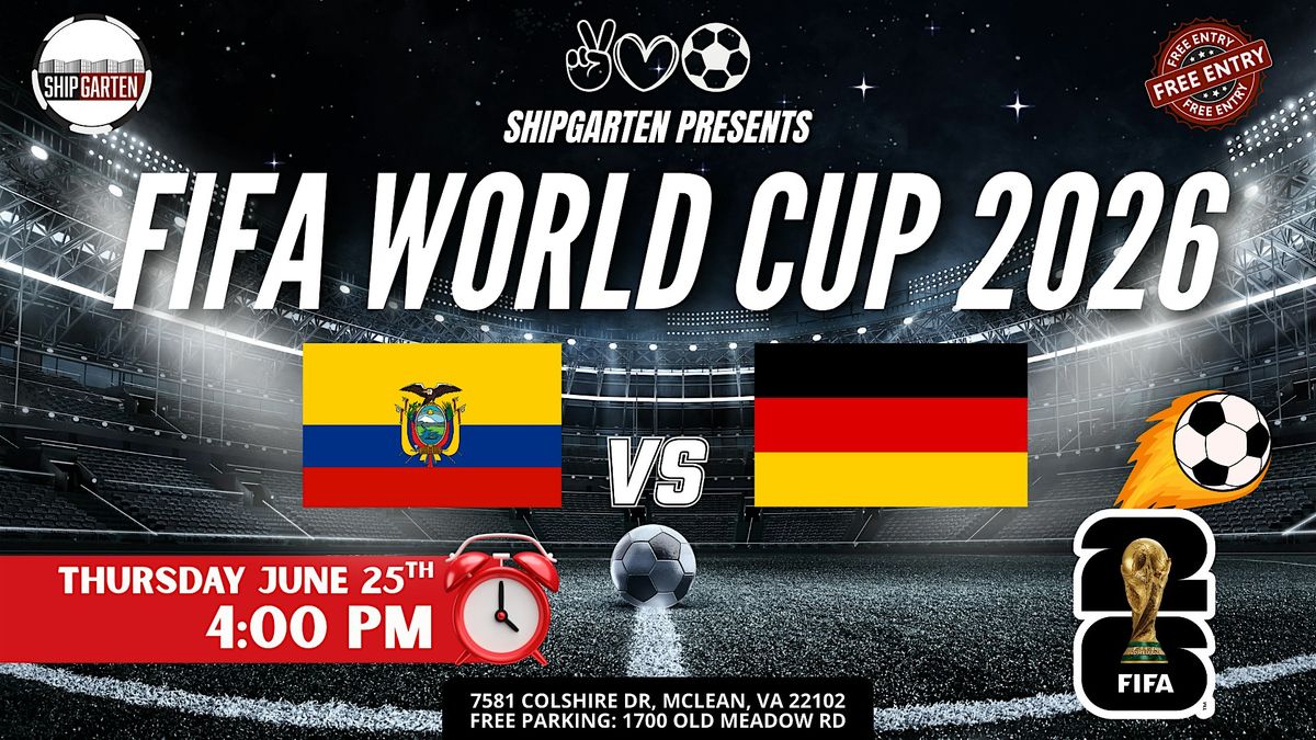 THURSDAY AFTERNOON. SPEED VS PRECISION. Germany brings structure, discipline, and World Cup dominance. Ecuador brings speed, altitude stamina, and fearless intensity. 4PM kickoff. After-work energy. Momentum building into the night. Shipgarten becomes the biggest World Cup watch party in Tysons. THIS IS HOW YOU WATCH A THURSDAY MATCH You leave work early. You grab a cold one. You don’t miss kickoff. Massive screens & stadium-level sound $40 Mix & Match Beer Buckets (5 – 16oz cans) 100+ beer varieties available All ages welcome (21+ to drink) The most energetic World Cup crowd in Tysons This isn’t background TV.This is full stadium energy. DISCIPLINE MEETS HEART Germany’s precision and tactical control. Ecuador’s pace and South American fire. Thursday at 4PM means the party starts early. Come straight from work. Stay for the celebration. GAME DAY DETAILS Thursday, June 25th Kickoff: 4:00 PM Shipgarten – 7581 Colshire Dr, McLean, VA 22102 FREE & large parking at 1700 Old Meadow Rd FREE ENTRY – Pay only for what you consume Coming with your crew? Upgrade your match day. More Info Click Here The biggest crowd. The coldest beer. The loudest World Cup in Tysons.