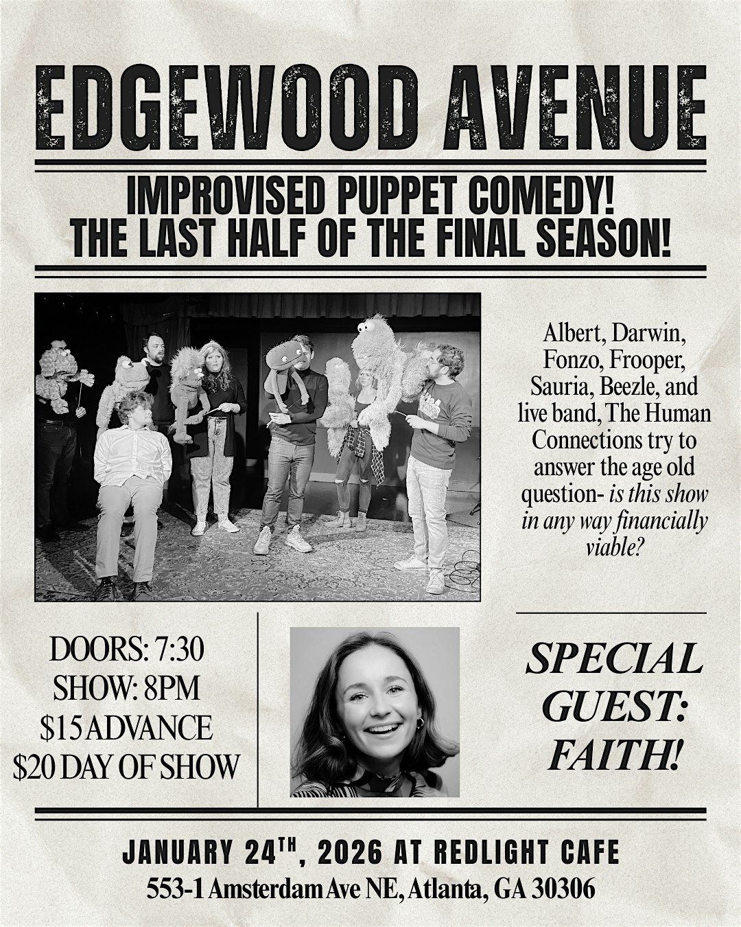 Edgewood Avenue is an improvised variety show featuring a mix of digital, musical, scripted, and improvised elements performed by a cast of puppets. Join Albert, Beezle, Darwin, Fonzo, Frooper, & Sauria as they navigate through the holiday season & finding the best presents…friendship! Alongside as always the incredible live band The Human Connections & special guest host!