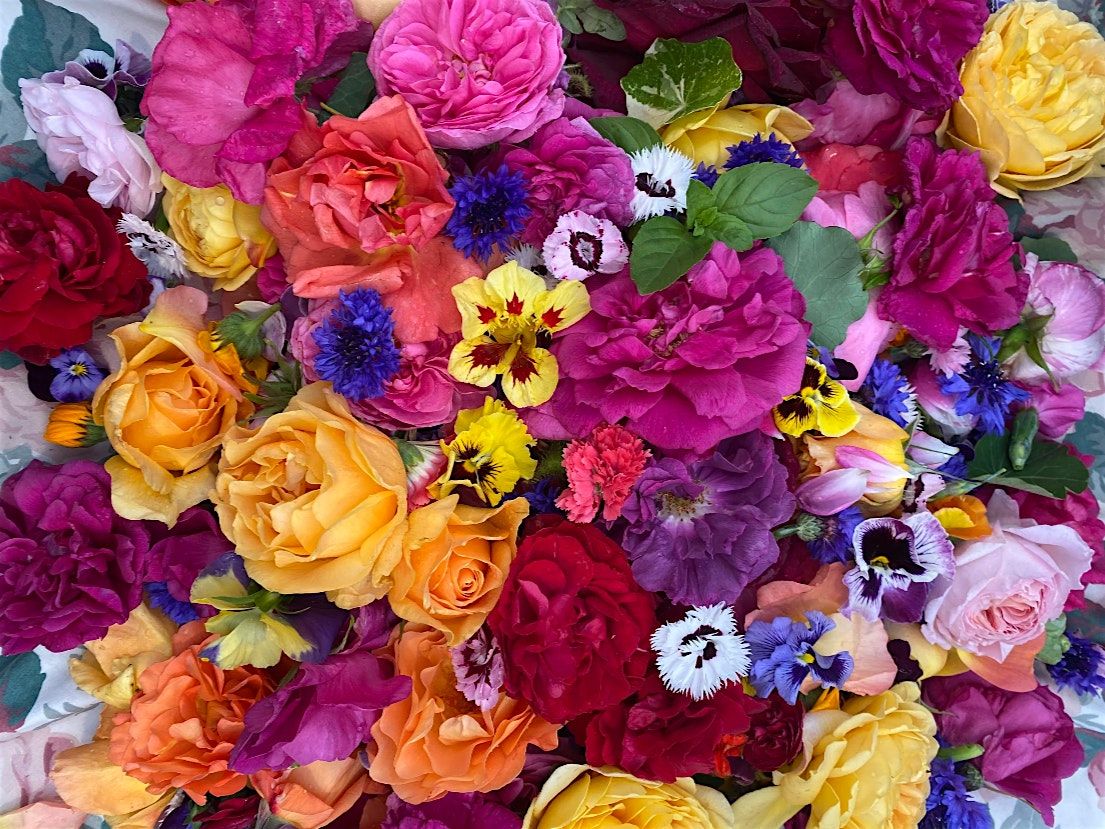 In class, make a flower-packed salad, plus herbal vinegar for a dressing for take-home.