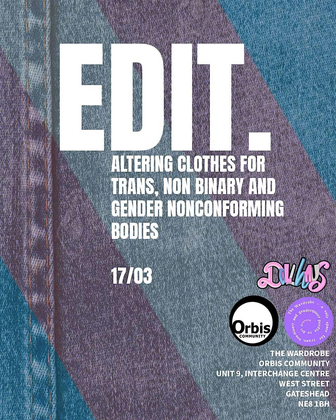 Dollhaus welcomes anyone who is trans, non-binary, or gender nonconforming to Edit, an alteration workshop to help people find their own self of style. Working with the Dolls, there will be local Heaton based designer, Oliver Oui, The Wardrobe, Transmutual Aid and local Orbis Community designers.