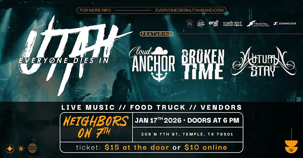Everyone Dies In Utah Live in Temple TX @ Neighbors on 7th; featuring support from: Cloud Anchor, Broken Time, and Autumn Stay. Doors at 6pm