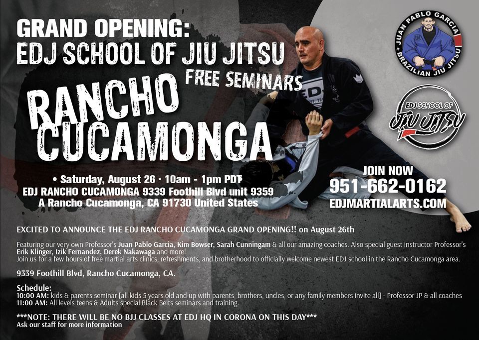 Join us for a few hours of free martial arts clinics, refreshments, and brotherhood to officially welcome newest EDJ school in the Rancho Cucamonga area.