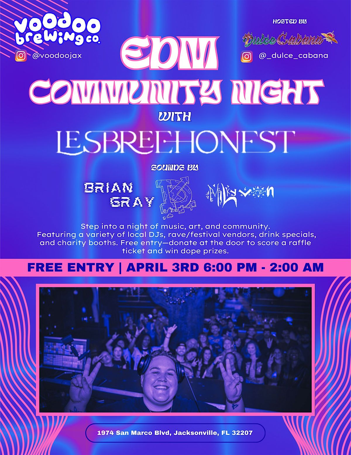 Get ready for an epic night at 1974 San Marco Blvd! Join fellow EDM lovers on April 3, 2026 at 6:00 PM (Eastern Time) for some great beats, good vibes, and awesome company. Whether you're here to dance or just chill, this is the place to be. Don’t miss out on the fun and the chance to connect with the community We be raffling off some prices and we have a whole vendor market. See you there!