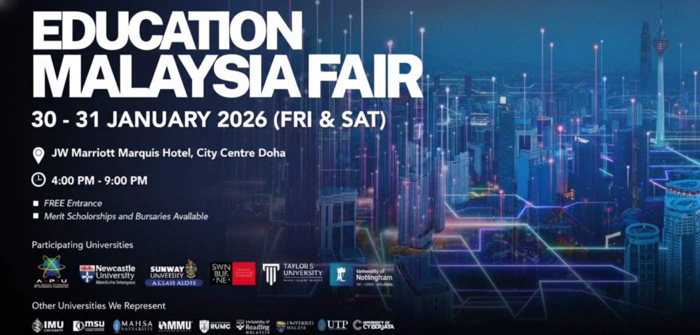 Don't miss the EDUCATION MALAYSIA FAIR in Doha! Meet Malaysian university representatives and explore study opportunities, including Merit Scholarships and Bursaries.