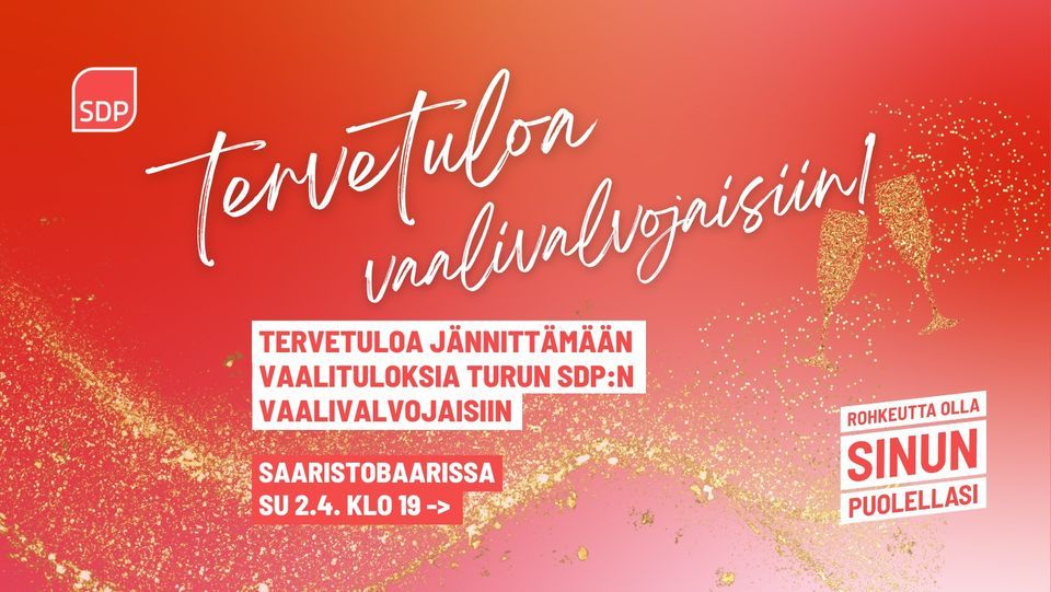 Lämpimästi tervetuloa jännittämään vaalituloksia Turun ja Varsinais-Suomen SDP:n vaalivalvojaisiin Saaristobaariin klo: 19 alkaen.(Aurakatu 14, 20100 Turku)