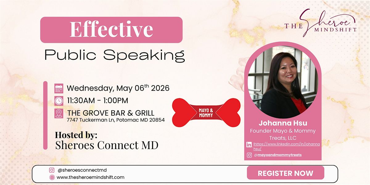 Join us on Wednesday, May 6th for an empowering SHEROES Connect MD In-Person Meeting, where we’ll dive into the art of Effective Public Speaking a key skill for every woman in business and leadership.