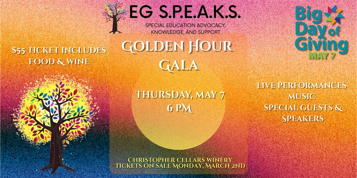 Join us for an unforgettable evening at the Golden Hour Gala, a celebration of community, advocacy, and impact. As the sun sets and the golden light fills the room, we’ll gather to uplift voices, honor changemakers, and raise critical funds to expand access to services and support for disabled youth and their families in our community. This will be EG SPEAK's first year participating in Sacramento Regional Foundation's Big Day of Giving and we are celebrating!