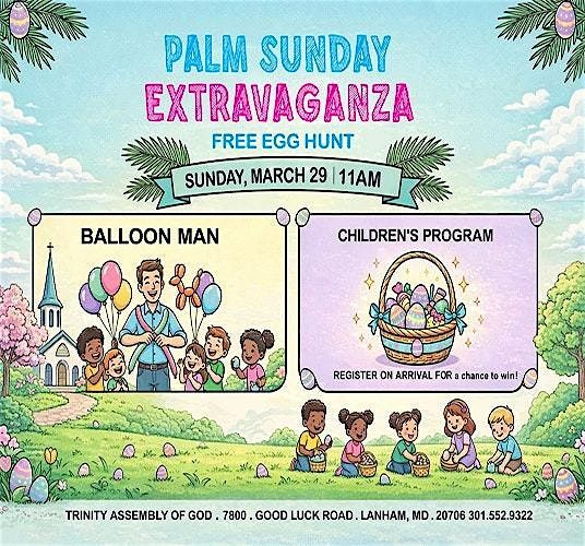 Celebrate Palm Sunday with us at 11am! FREE Egg Hunt, ages 2 -12, Christ-centered program, balloon artist, prize drawings. Bring a basket