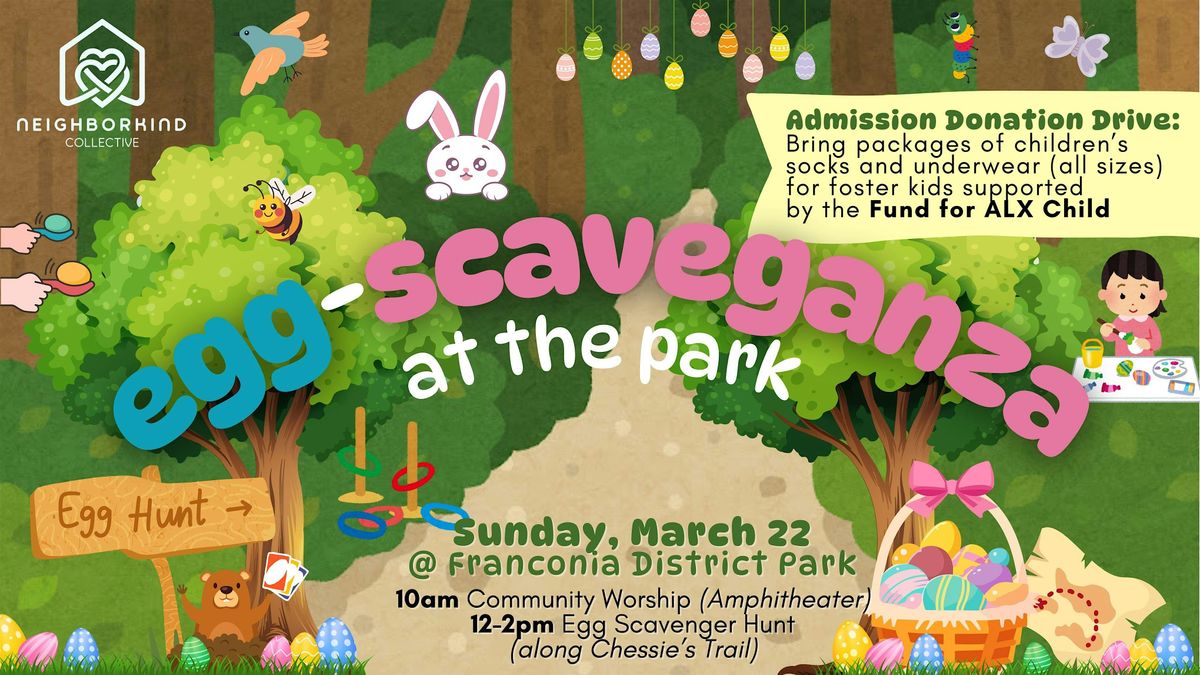 Join the Neighborkind Collective for our 2nd annual community Egg Scavenger Hunt along Chessie's Trail at Franconia District Park, full of interactive surprises and fun along the way for families with kids of all ages, on Sunday, March 22 from 12:00-2:00pm, immediately following a 10:00am community worship service at the park's amphitheater.