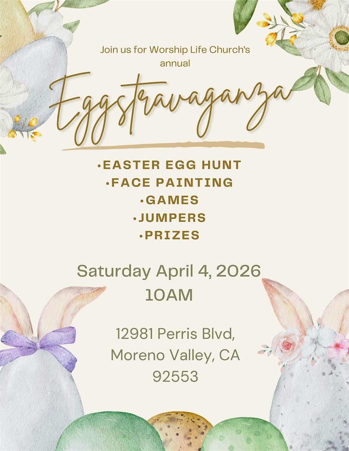 Join us for a fun-filled morning at Worship Life Church’s Annual Eggstravaganza! This free community event is designed for families and children to celebrate the joy of the Easter season together.