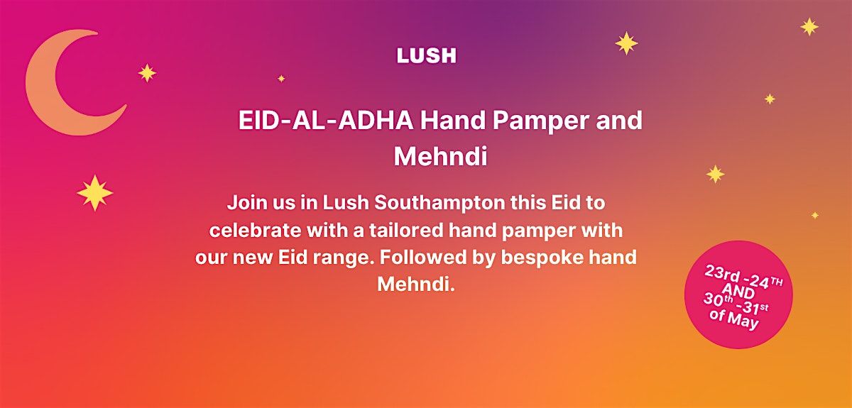 Join us in Lush Southampton this Eid to celebrate with a tailored hand pamper with our new Eid range. Followed by bespoke hand Mehndi.About this Event