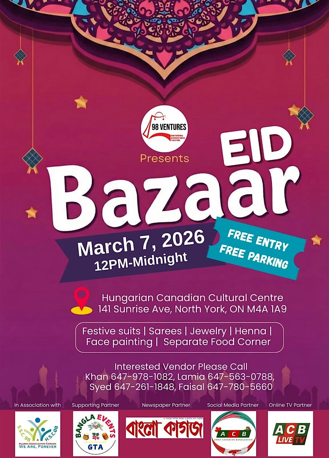 Join us for Eid Bazaar 2026 on March 7! Shop fashion, jewelry & food in North York. FREE Entry & Parking. Fun for the whole family!