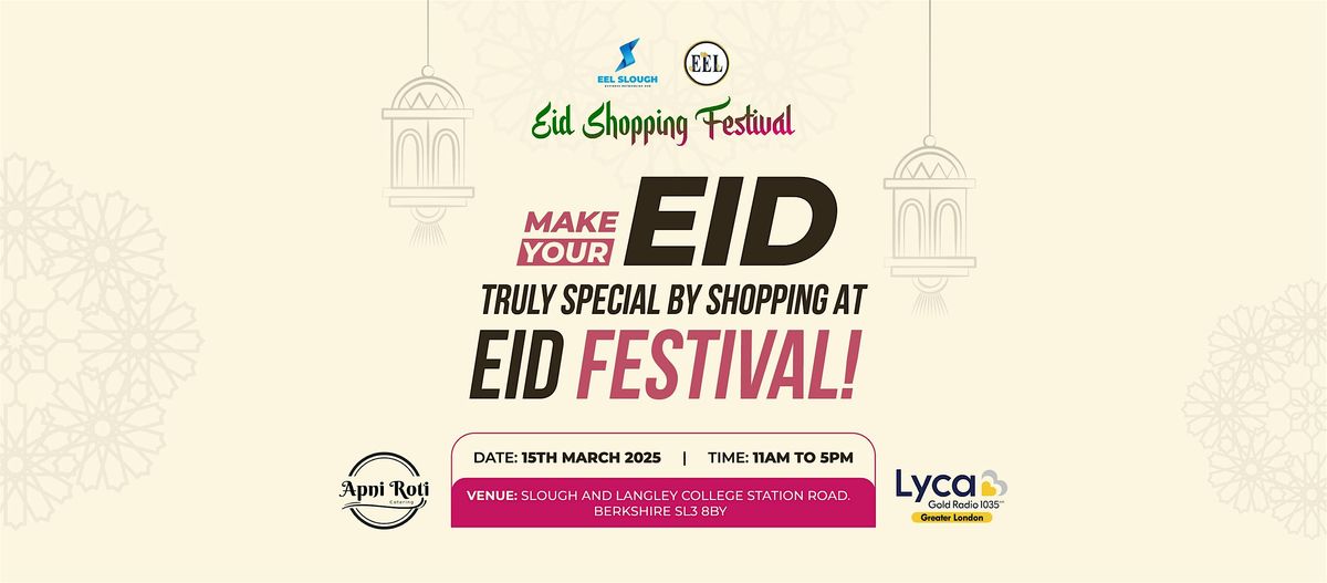 Welcome to the Eid Shopping Festival in Slough! Get ready for a day full of fun, food, and fabulous finds. Join us at Slough & Langley College on Sun Mar 15th 2026 starting at 11:00 AM for a day of shopping, entertainment, and community spirit.