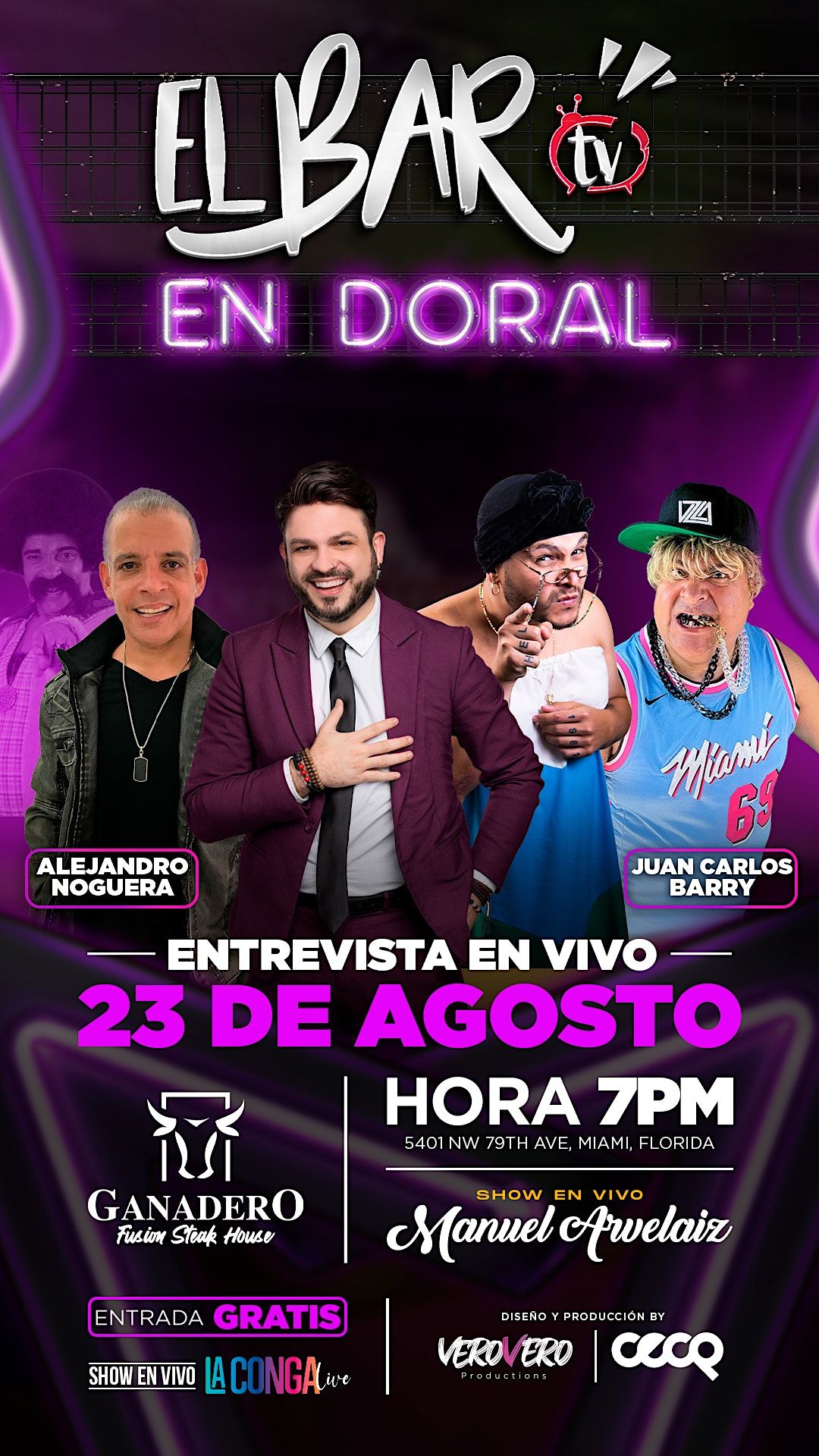 EL Bar Tv por primera vez en el DORAL , disfrutaras de un show completamente nuevo en su temporada #5 junto a 2 grandes invitados JuanCarlos Barry y Alejandro Noguera "Charlys Mata" , disfrutaremos de la musica en vivo de " LA CONGA LIVE" y tambien estara invitado un gran cantante de la ciudad de miami " Manuel Arvelaiz" un show de 2 horas donde moriras de la risa y por supuesto no puede faltar " Dona RUMARDA" junto a DAVID PARRA pasaran una noche diferente y llena de muchas sorpresas, regalos y concursos. Los esperamos este 23 de Agosto.