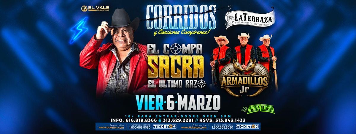 Experience the exciting event 'EL COMPA SACRA & ARMADILLOS JR' at LA TERRAZA, Detroit, MI, United States. This must-attend gathering promises an unforgettable experience for all attendees. Join us for a day filled with innovation, networking, and inspiration. Register now to secure your spot at this landmark event. #ELCOMPASACRA&ARMADILLOSJR #event #exciting #DetroitEvents #MIEvents
