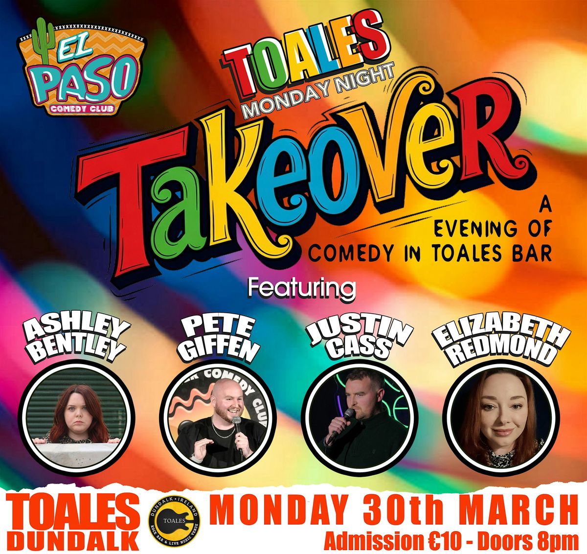 Canadian comic Justin Cass brings a relaxed storytelling style shaped by life in small-town Alberta, while Ms El Paso herself Elizabeth Redmond hosts the evening in her true Texas/Dundalk style!!