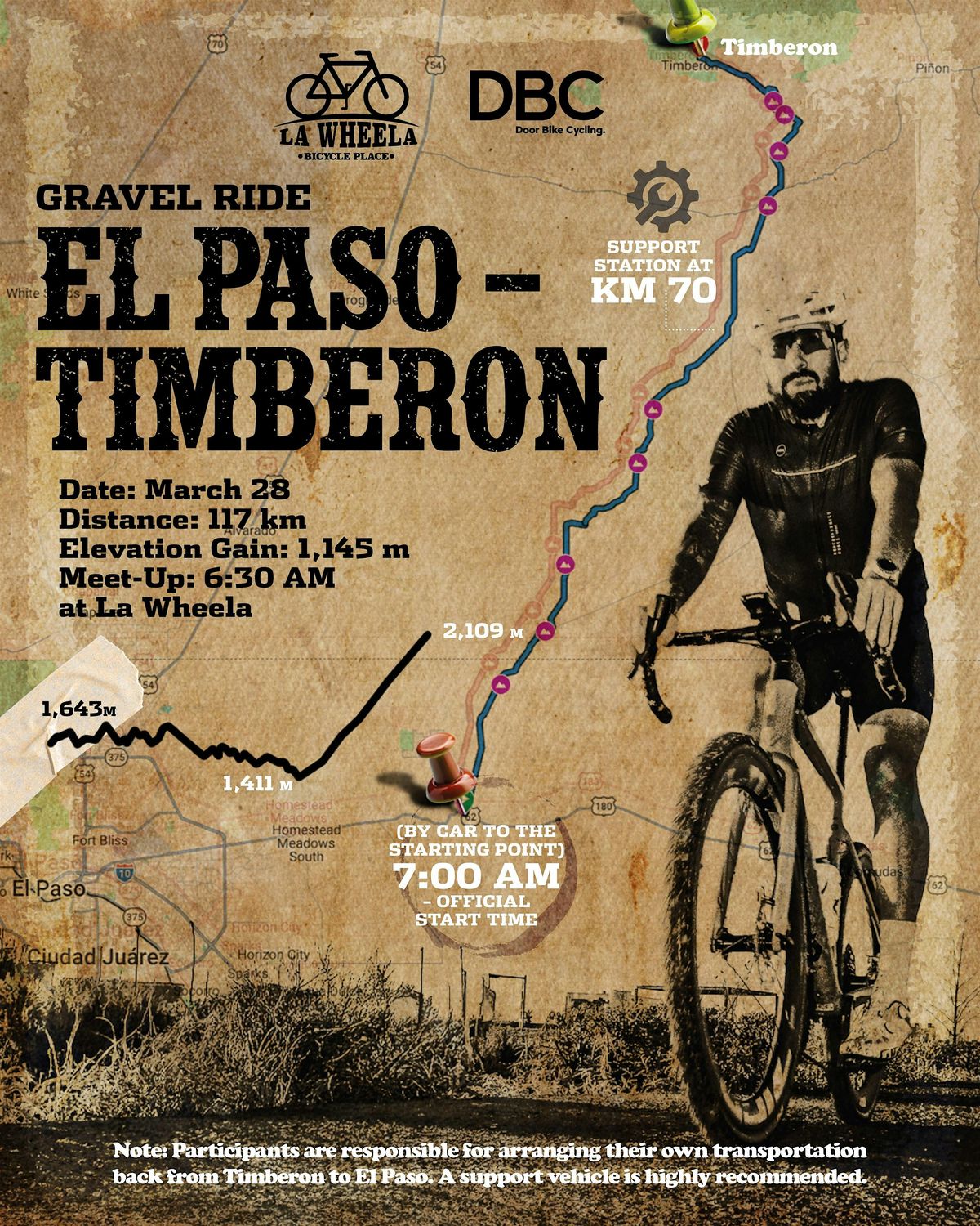 Each participant is responsible for arranging their own transportation from Timberon back to El Paso. We strongly recommend coordinating a support vehicle or ride back before the event.