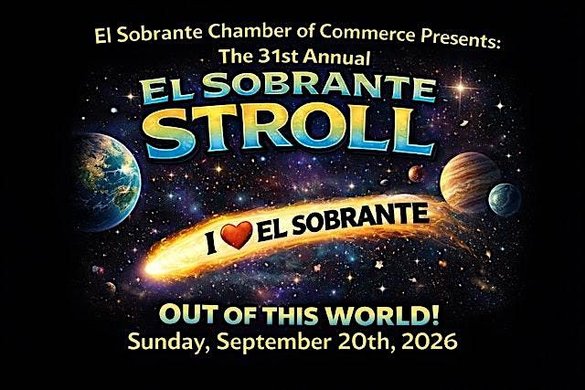 Our Annual El Sobrante Stroll will be "Out of This World" in 2026. On Sunday, Sept. 20th, San Pablo Dam rd. will be closed to cars from El Portal Dr to Appian Way all day to create a one-half mile long block party. Enjoy live music, great food, over 100 vendors selling anything you can dream of and more. The day kicks off with a parade at 11am, followed by strolling along the Dam Rd. to see the vendors, the Classic Car show, watch a BMX Bike show, listen to live music at five different venues and learn about the El Sobrante community through various information booths presented by the community organizations participating. Great fun for everyone. More information at https://www.elsobrantechamber.com/stroll/