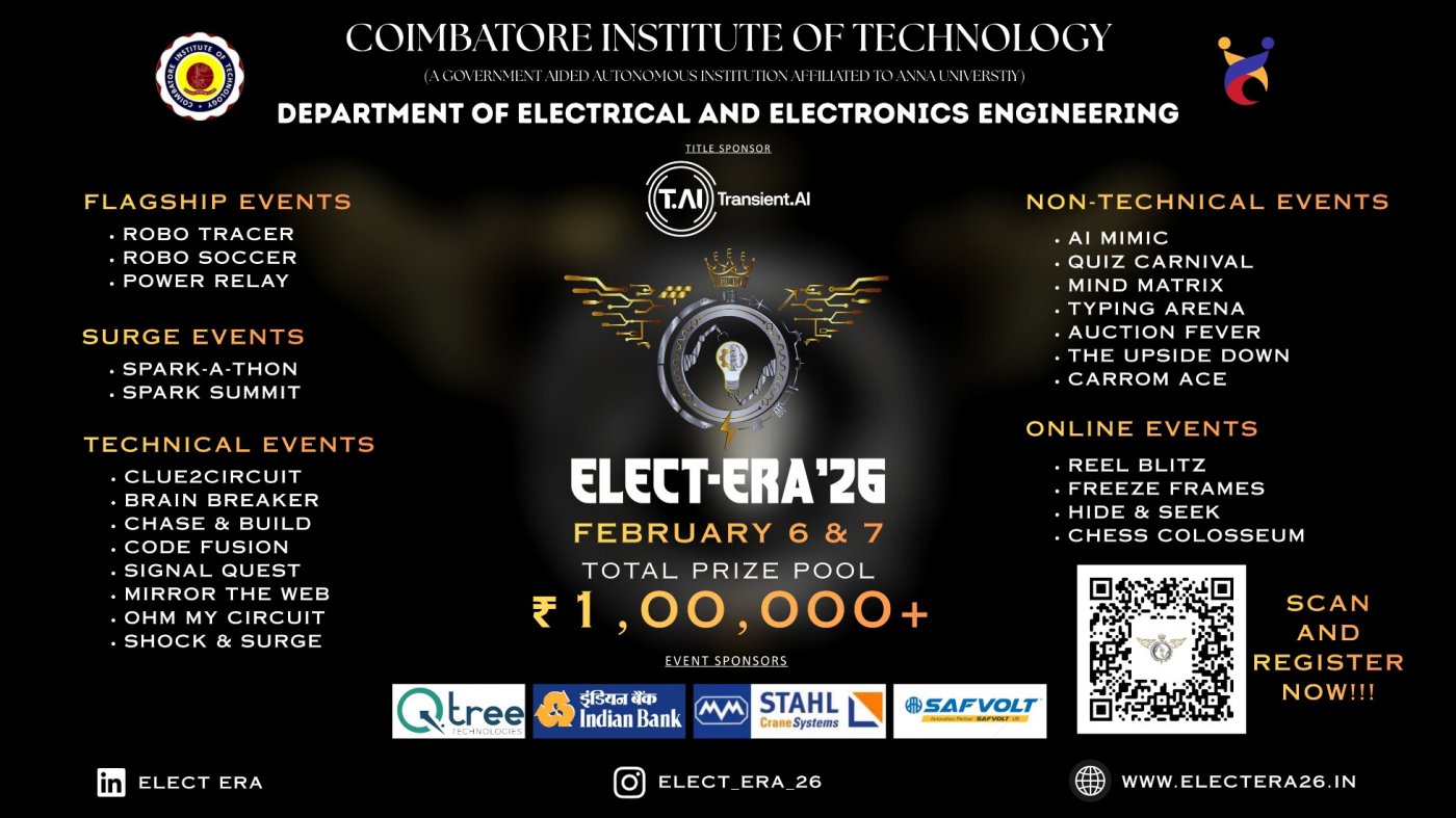 ELECT-ERA ’26 is a national-level technical and non-technical symposium powered by the Department of Electrical and Electronics Engineering, Coimbatore Institute of Technology, Coimbatore. ⚡ It brings together innovators, coders, circuit designers, robotics enthusiasts, AI learners and creative minds for a full lineup of flagship events, fun non-tech battles, and industry-driven workshops. From Robo Soccer and power-focused challenges to online treasure hunts, photography contests and Smart Factory 4.0/AI sessions, ELECT-ERA ’26 is the perfect stage to showcase your skills, build your network and experience real engineering vibes. Join us on 6–7 February 2026 at CIT and be part of the spark that turns into a storm!