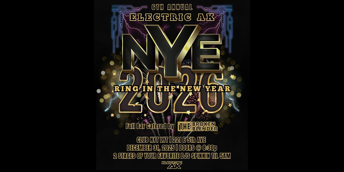 Get ready for Alaska's hottest New Year's Eve! ElectricAK presents our 6th annual NYE party at Club Nyt Lyt. Join us Wednesday, December 31, 2025 from 8 :30PM – 5 AM at Club Nyt Lyt for a night of nonstop dance music, dazzling lights, and unforgettable moments. Expect a curated lineup of our beloved local DJs across 2 stages, a midnight countdown, enjoy a full bar catered by The Broken Blender [Last call at 2:30a] and the best vibes in Alaska—all produced by the only all-inclusive event‑production team in the state. Dance the night away, snap unforgettable photos, and step into 2026 in the Last Frontier's hottest dance club!