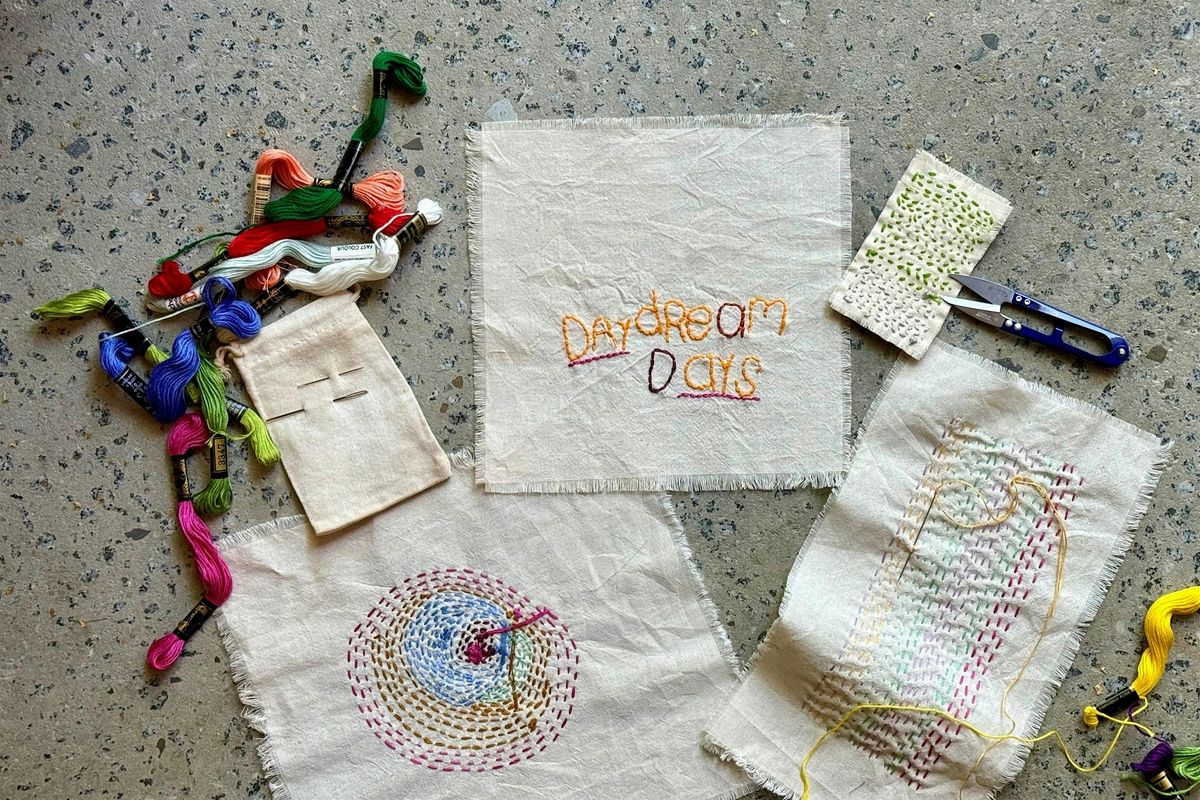 Participants are invited to stitch a word that resonates personally or to follow their intuition through pattern, texture and mark-making. There are no rules or expectations— this experience is about the meditative rhythm of stitching and the pleasure of slowing down together.