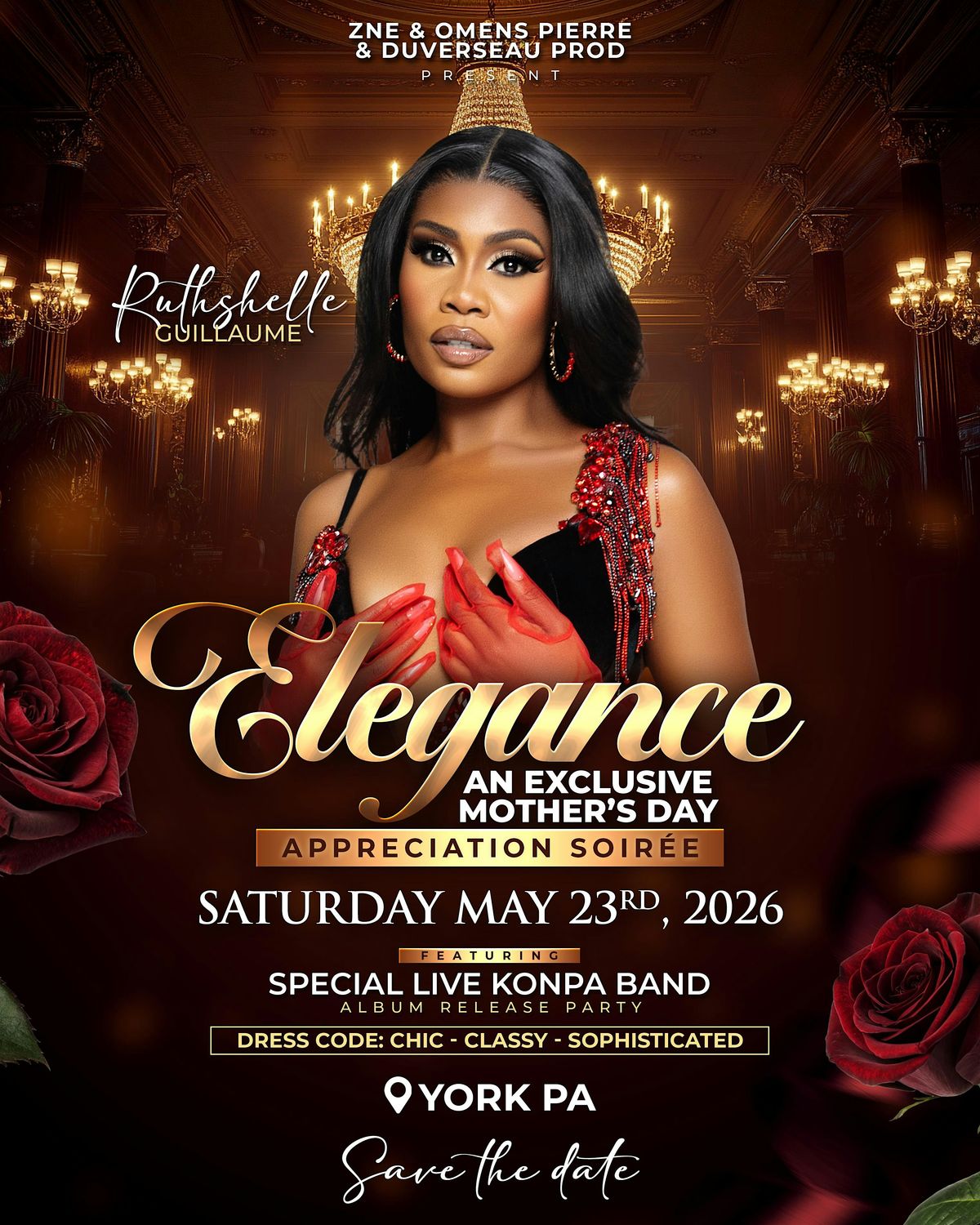 ZNE, Omens Pierre & Duverseau Prod, Invite you all to the finest and Luxurious Afro Caribbean Concert in York PA on May 2025. 2024. This event has for purpose to promote the Afro Caribbean culture and its diversities in the Lancaster Community. “Elegance” featuring Haiti’s one of the Hottest Haitian Caribbean Diva, Rutshelle Guillaume will be performing live with her live band at the Inn at YORK. The name of the event fully describe the ambiance that we will have going on that day.