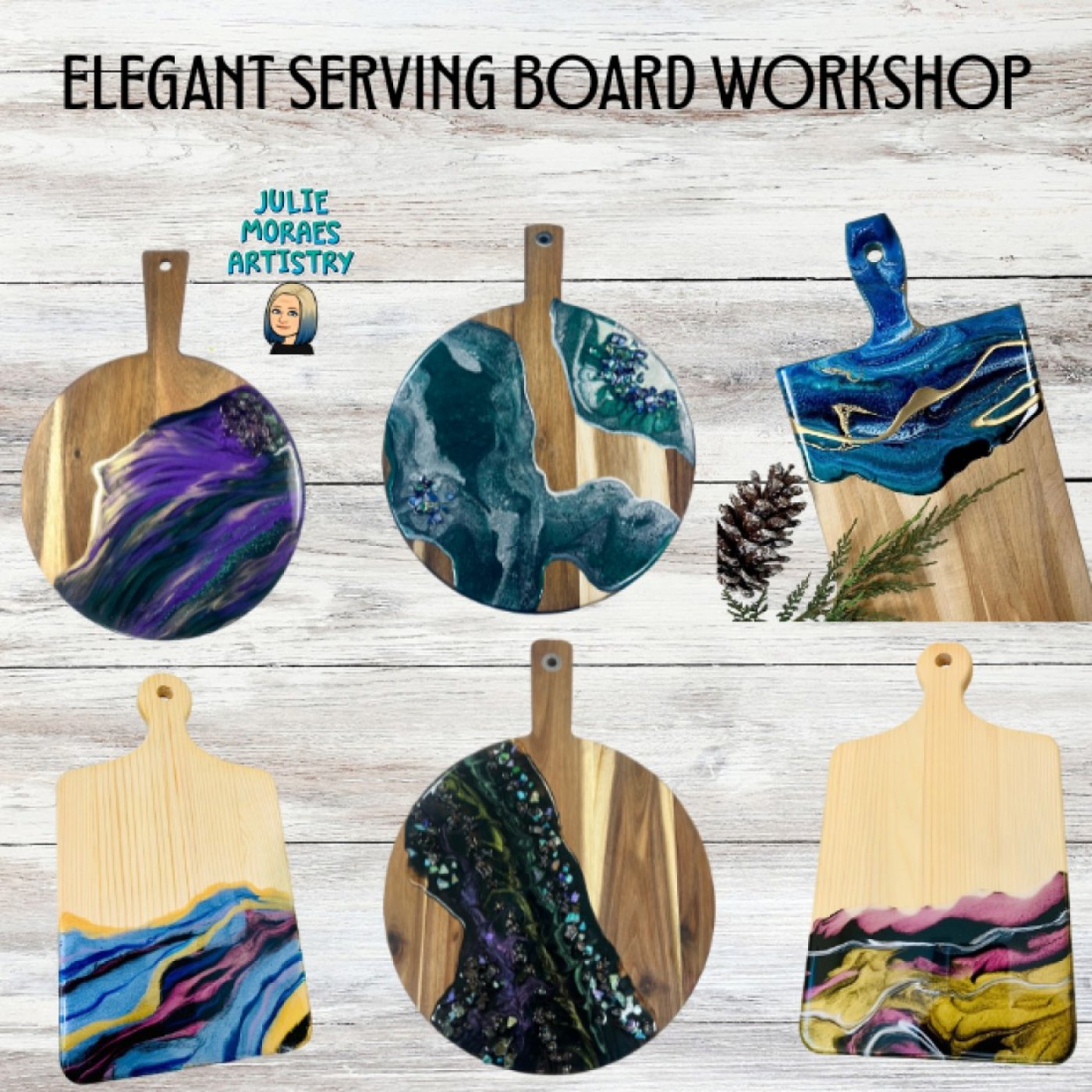 Learn the basics of working with resin as an abstract fluid technique to create a unique one-of-a-kind functional serving board. We will be using a large ROUND Acacia board.