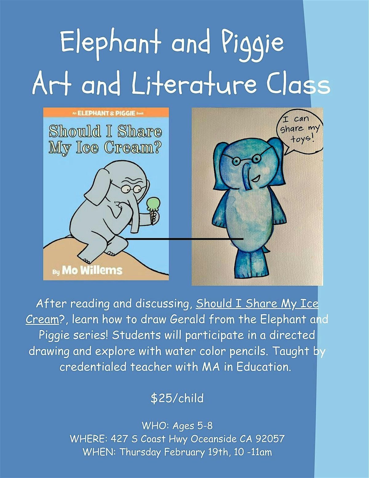 After reading and discussing, Should I Share My Ice Cream?, learn how to draw Gerald from the Elephant and Piggie series! Students will participate in a directed drawing and explore with water color pencils. Taught by credentialed teacher with MA in Education. 5-8 yrs