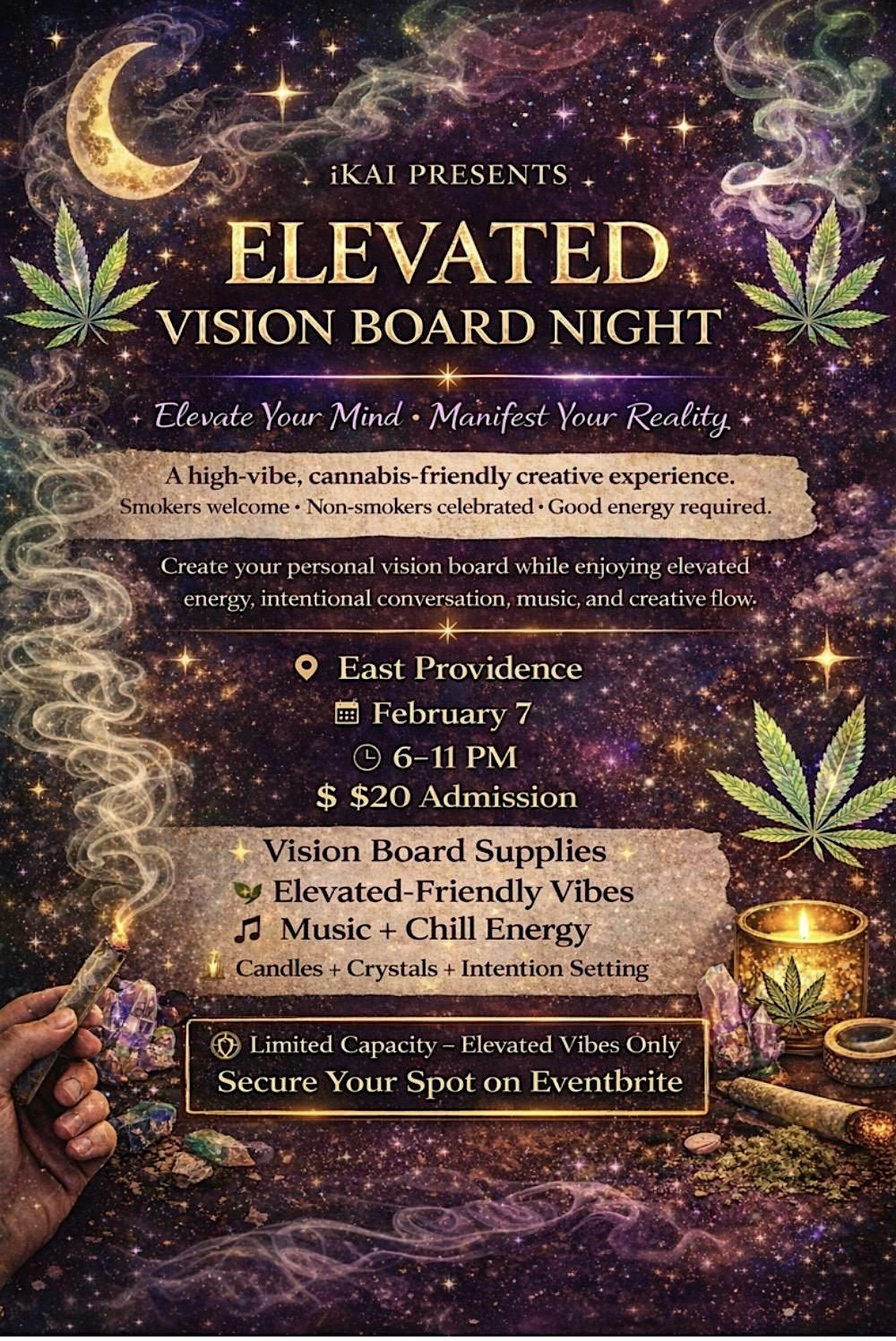 Ready to vibe and share your boldest ideas? Join us for Elevated Vision Board Night — an epic evening where creativity flows and visions take flight. A high-vibe cannabis-friendly creative experience.