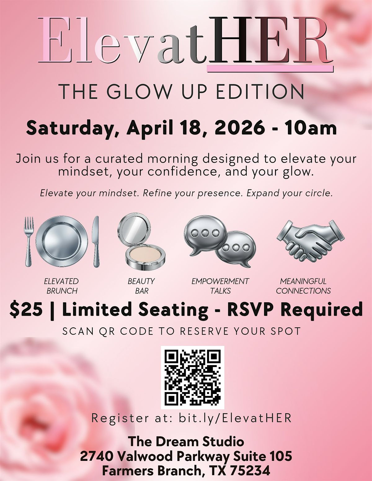 Get ready to shine bright at The Dream Studio on April 18, 2026 at 10:00 AM! This is your chance to elevate your vibe and embrace your glow in a fun, relaxed setting. Grab your girls amd get in the room to be ELEVATED! Amazing fellowship, brunch and beauty bar!