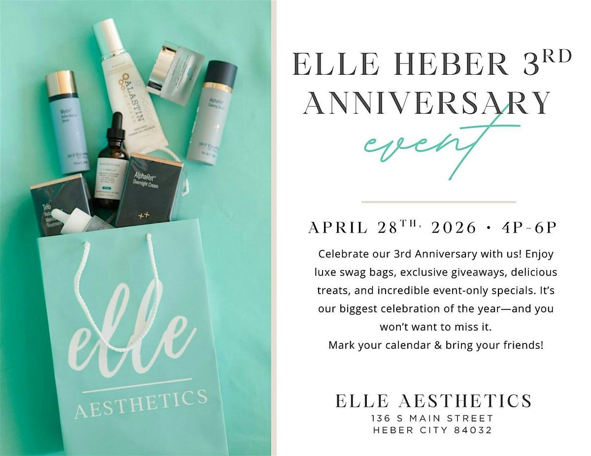 Join us April 28, 4–6pm for the Elle Aesthetics Heber 3rd Anniversary Specials, treats & giveaways you won’t want to miss!