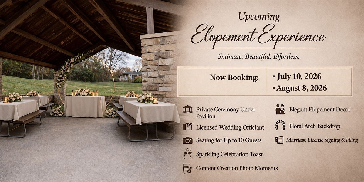 A romantic pavilion elopement with décor, officiant, celebration toast, photos, and seamless license signing included.