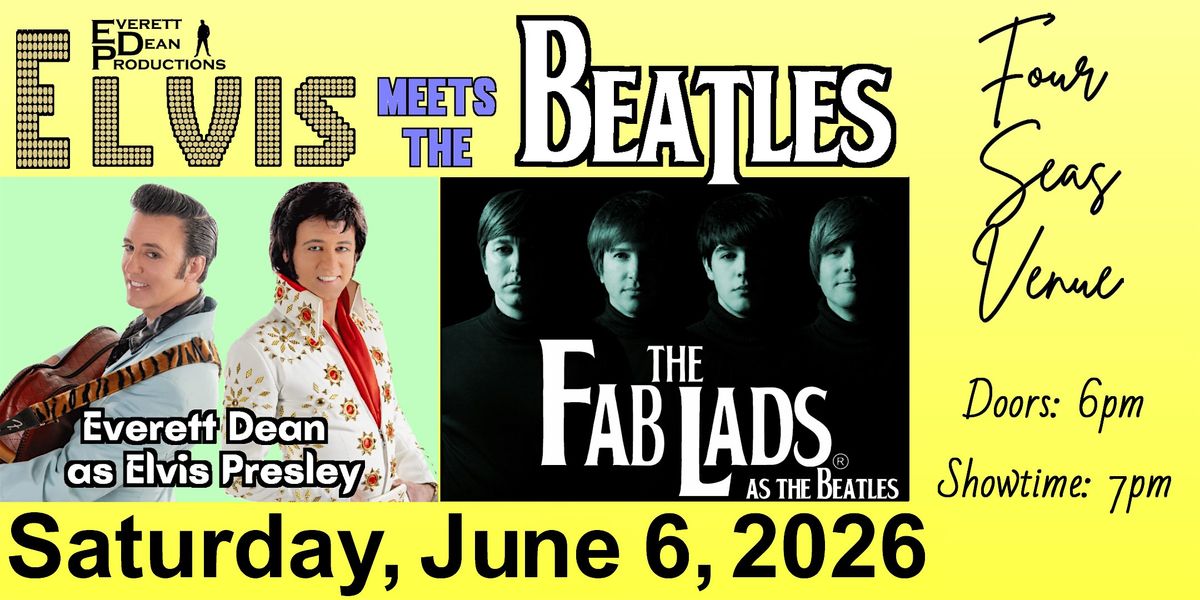 Welcome to ELVIS MEETS THE BEATLES live tribute concert at the Four Seas Venue in St. Louis, MO! Get ready to rock out on SATURDAY, JUNE 6, 2026 at 7:00 PM (Central Time). It's going to be an epic night filled with classic tunes with a tribute to rock music's two biggest acts: ELVIS PRESLEY & THE BEATLES! Don't miss this incredible concert that will transport you back in time to the golden era of rock music. ELVIS MEETS THE BEATLES is not only a concert, it's an experience; along with replica costumes and musical instruments, you will think the stars are there right in front of your eyes! Grab your tickets now and get ready to rock your night away!!! There will also be a cash bar and food available for purchase at the venue!!!