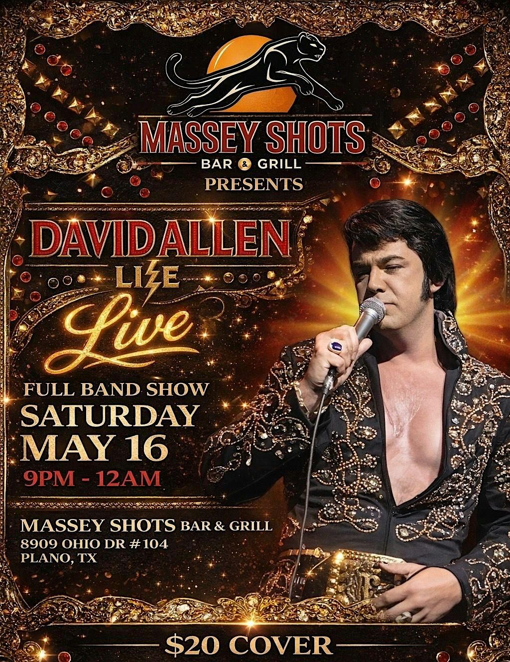 Get ready for an unforgettable evening with David Allen bringing the King of Rock 'n' Roll back to life! Join us in person at Massey Shots for a night filled with classic Elvis hits, great vibes, and lots of fun. Whether you're a longtime fan or just love good music, this is the place to be. Don’t miss out on this awesome tribute to the legend himself!