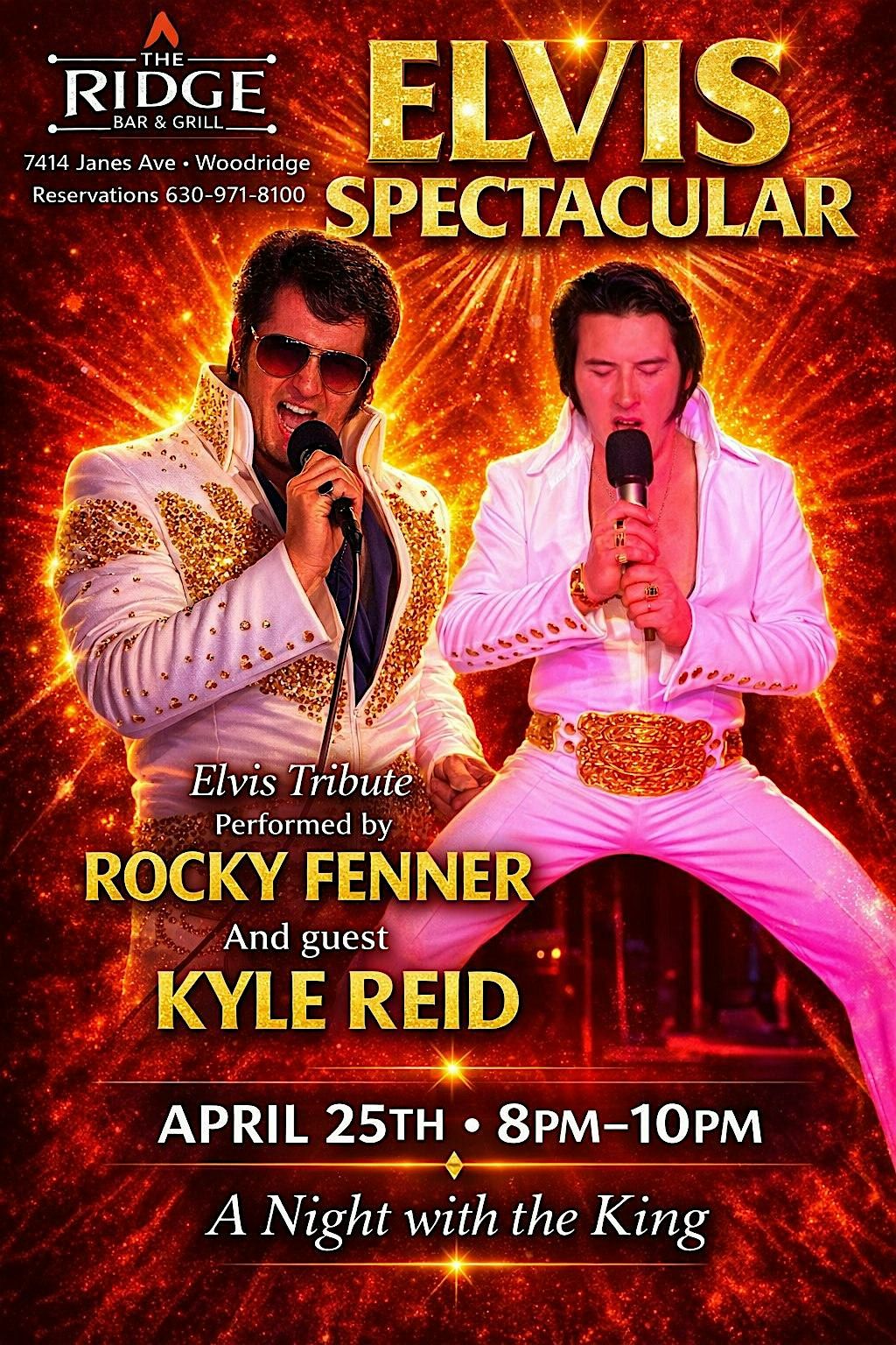 2 dynamic Elvis Tribute artists Rocky Fenner and Kyle Reid get ready for an explosion of Elvis Hits and moderately priced entrees.