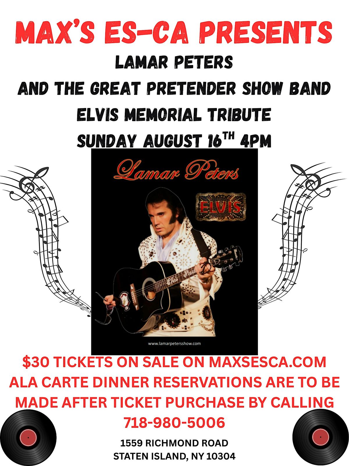 Join Lamar Peters & The Great Pretender Show Band live at Max's Es-ca on August 16, 2026 at 4:00 PM (Eastern Time). It's gonna be a fun, laid-back evening filled with classic Elvis vibes and great tunes. Don’t miss out on this awesome in-person show that’s perfect for fans and anyone who loves a good time. Bring your friends and let’s rock the night away!