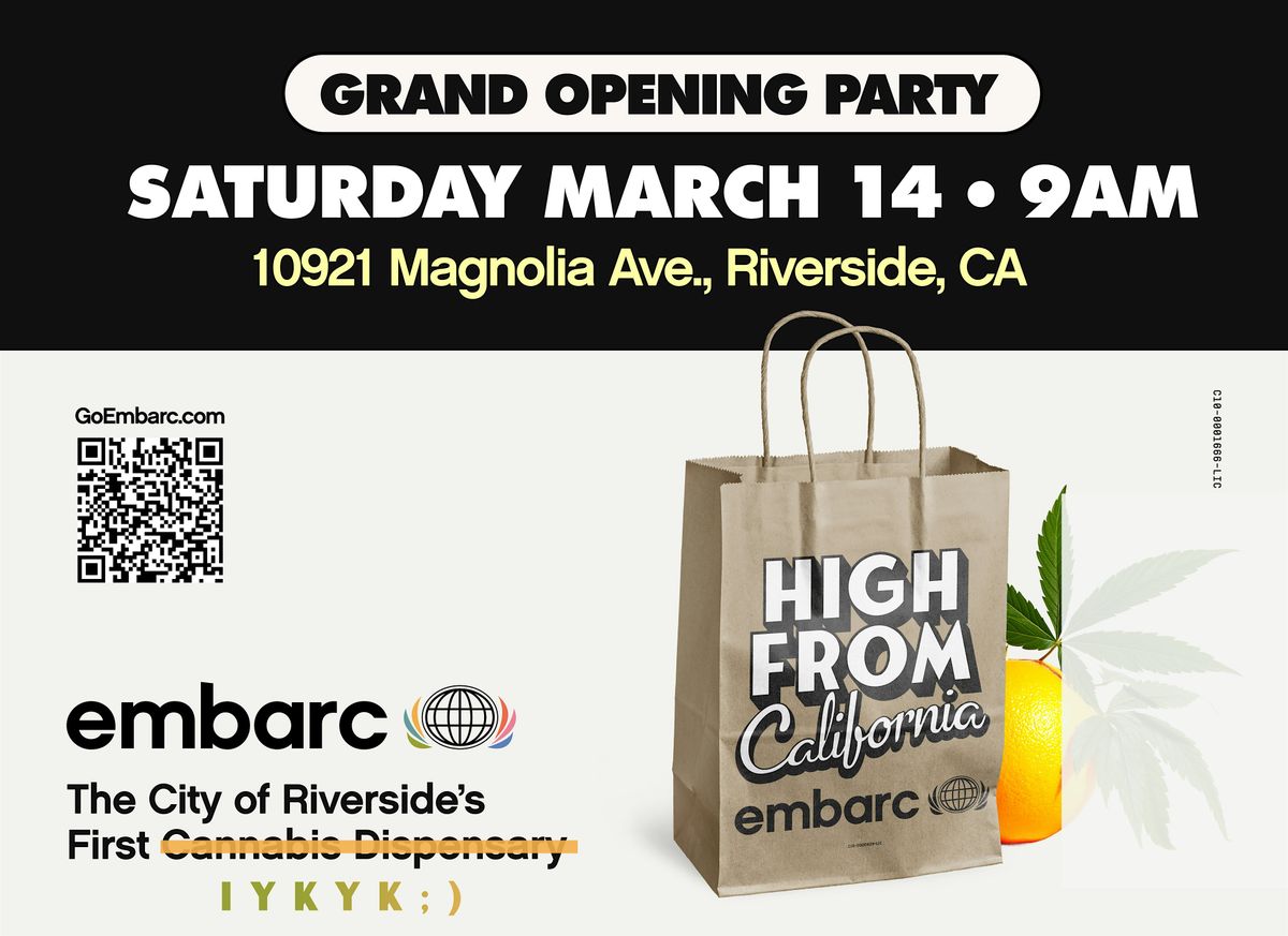 Riverside, it’s time to turn up! Be part of local history and join us as we celebrate Riverside’s first legal shop of its kind at the Grand Opening of Embarc Riverside with giveaways, music, munchies, and all‑day deals.