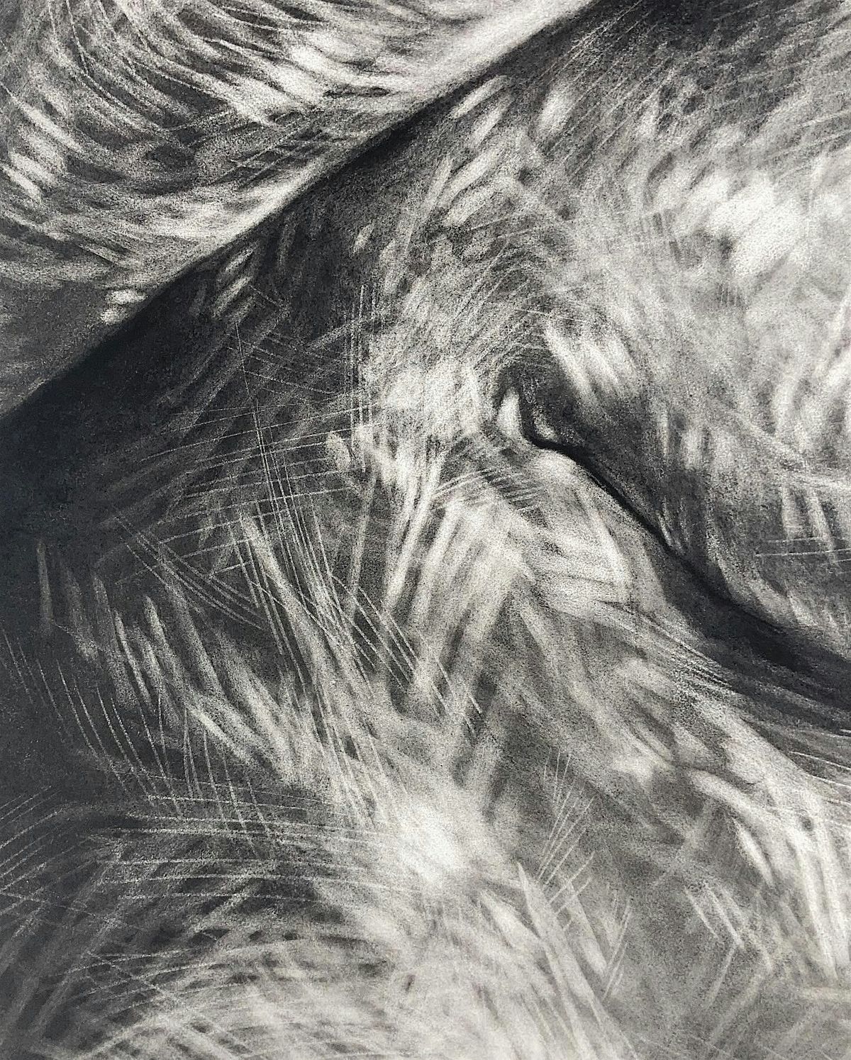 About the Exhibit: Flesh & Flame is a drawing-based installation that uses charcoal, poetry, and dark charcoal voids to evoke the integration of mind and body. A monolithic figurative drawing, relying on reductive mark making and deep blacks, creates a lush and immersive surface to anchor into the physicality of the body, while the surrounding poetry digs into the emotional complexity of reconnecting with that physicality. The installation will confront the body as both person and object outside of the technosphere of media. The concept is deeply rooted in coming to terms with a body haunted by chronic pain and fatigue.