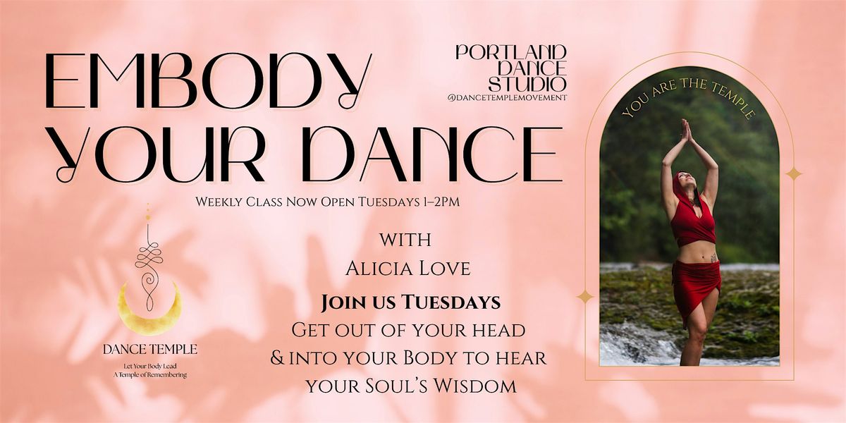 Embody Your Dance is a weekly somatic dance experience taught by Alicia Love, that blends ancient belly dance–inspired movement, intuitive flow, and embodied awareness. Through hip circles, undulations, and fluid, serpentine motion, you’ll reconnect with your body’s natural rhythm, sensual aliveness, and inner expression.