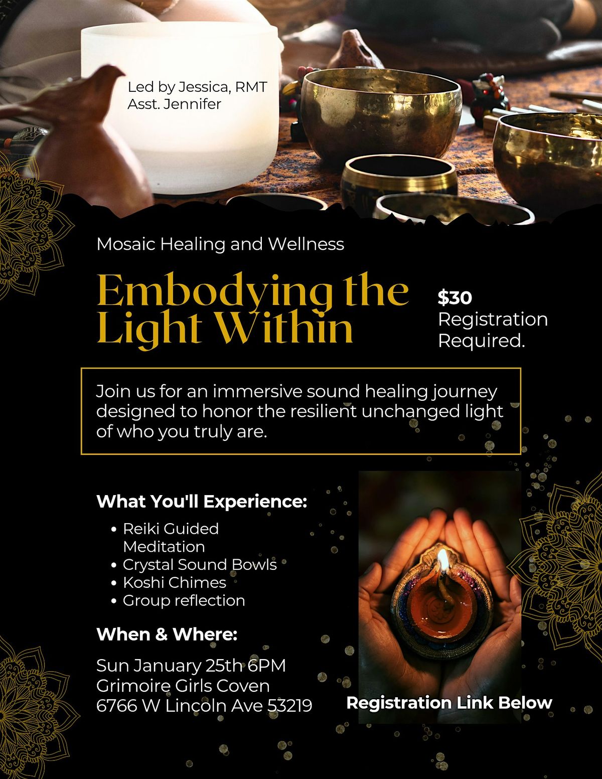 Jessica Burns, owner of Mosaic Healing and Wellness invites you to step into a safe space of gentle support and quiet reflection, where the soft resonance of crystal bowls and koshi chimes cradle your body and mind. This sacred sound bath is designed to support relaxation and allow the light of who you are to grow and your inner radiance can shine.