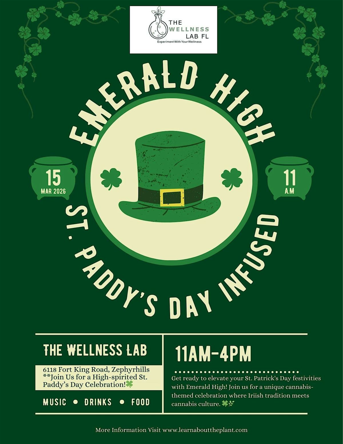 Emerald High is here! Irish brunch, infused mimosas, games, music & green vibes all day at The Wellness Lab. $5 at the door. 11am-4pm