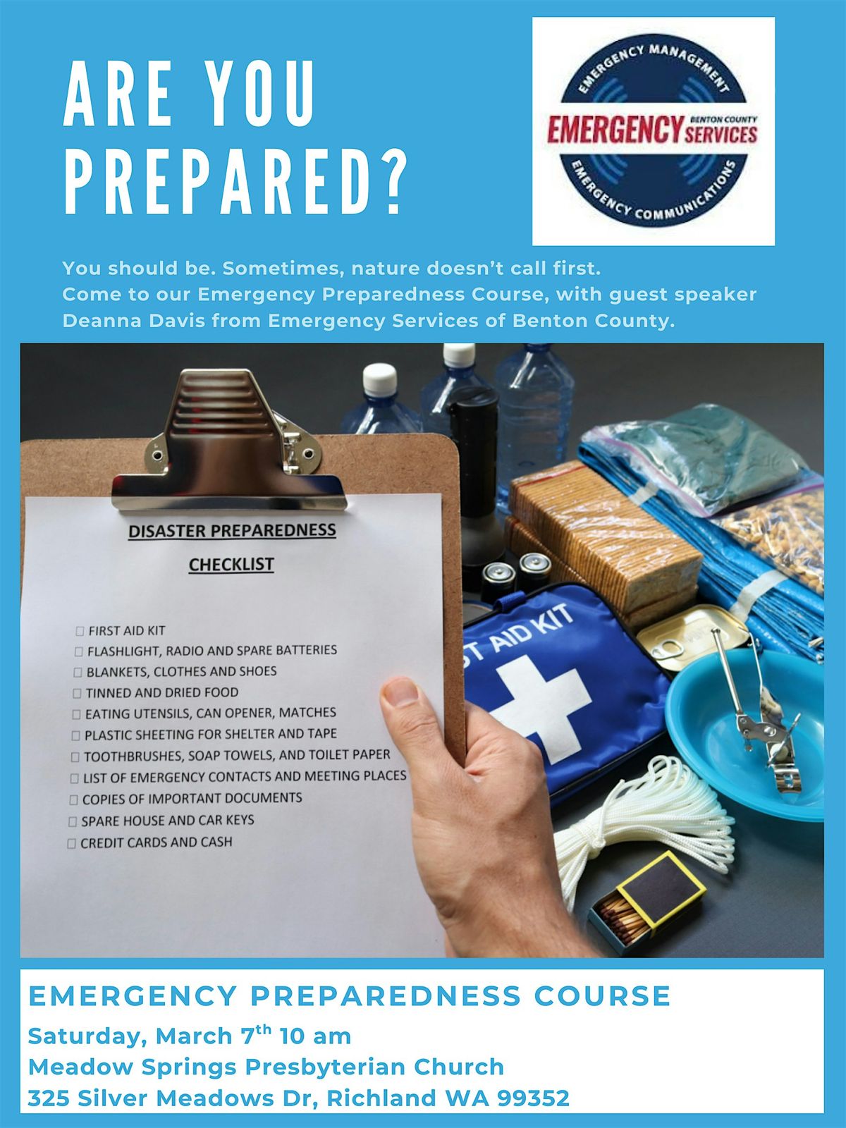 Deana Davis, representing Benton County Emergency Services, will lead the course and provide valuable insights on essential preparedness topics. Her experience and practical advice will ensure you are well-prepared for a variety of emergency situations in our community.
